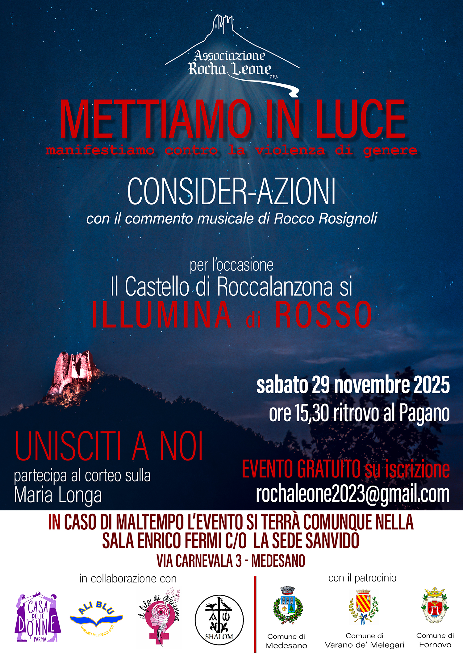 Seconda edizione della Manifestazione organizzata dall'Associazione in occasione della Giornata Internazionale contro la violenza di genere, in collaborazione con la Casa delle Donne di Parma, Il Filo di Arianna, Ali Blu e la comunità di Betania odv. L'evento per il 2025 ha allargato i propri confini con la partecipazione dei comuni limitrofi e con il patrocinio del Comune di Medesano, del Comune di Varano de' Melegari e del Comune di Fornovo. L'evento ha provocato e l'occasione è stata perfetta per riflettere e confrontarsi sul tema della Violenza di genere. Il commento musicale di Rocco Rosignoli ha amplificato il messaggio.